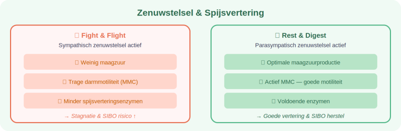 Regulatie van het zenuwstelsel is nodig voor de aanmaak van voldoende maagzuur, de vrijgave van spijsverteringsenzymen en een goede stoelgang — allemaal voorwaarden voor herstel van SIBO.