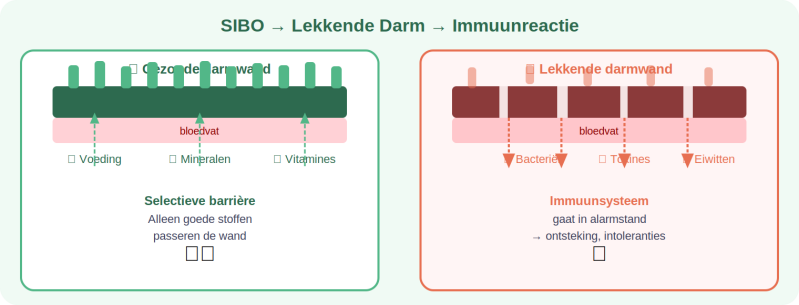 De bacteriën bij SIBO produceren gassen die ontsteking veroorzaken. Die ontsteking beschadigt de darmwand. Het gevolg: onverteerde eiwitten, bacteriën en afvalstoffen lekken door de darmwand de bloedbaan in.